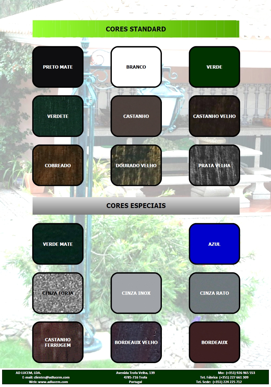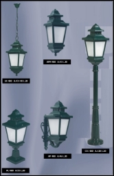 Candeeiros de jardim e de rua. Balizadores, lanternas, apliques de parede e de canto, pilares.
