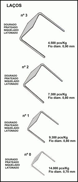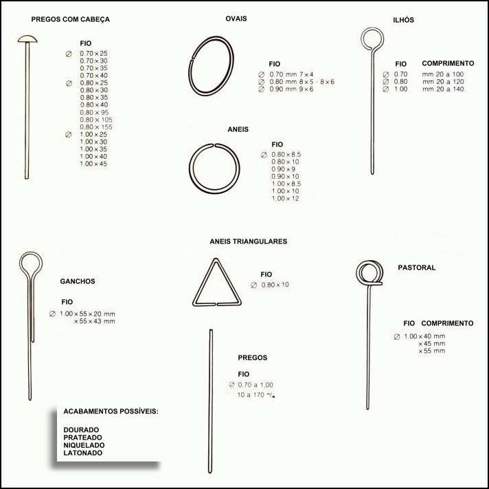 Acabamentos em Dourado (banho de Ouro), Niquelado (Prateado) e Ouro Velho (Latonado).